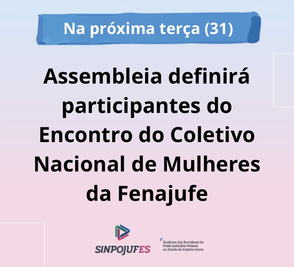 O Sinpojufes promoverá, na próxima terça-feira (31), assembleia geral extraordinária para escolher as participantes do Encontro do Coletivo Nacional de Mulheres da Fenajufe, que será realizado nos dias 25 e 26 de abril, em Brasília. O sindicato irá inscrever duas servidoras filiadas para participação presencial no evento.