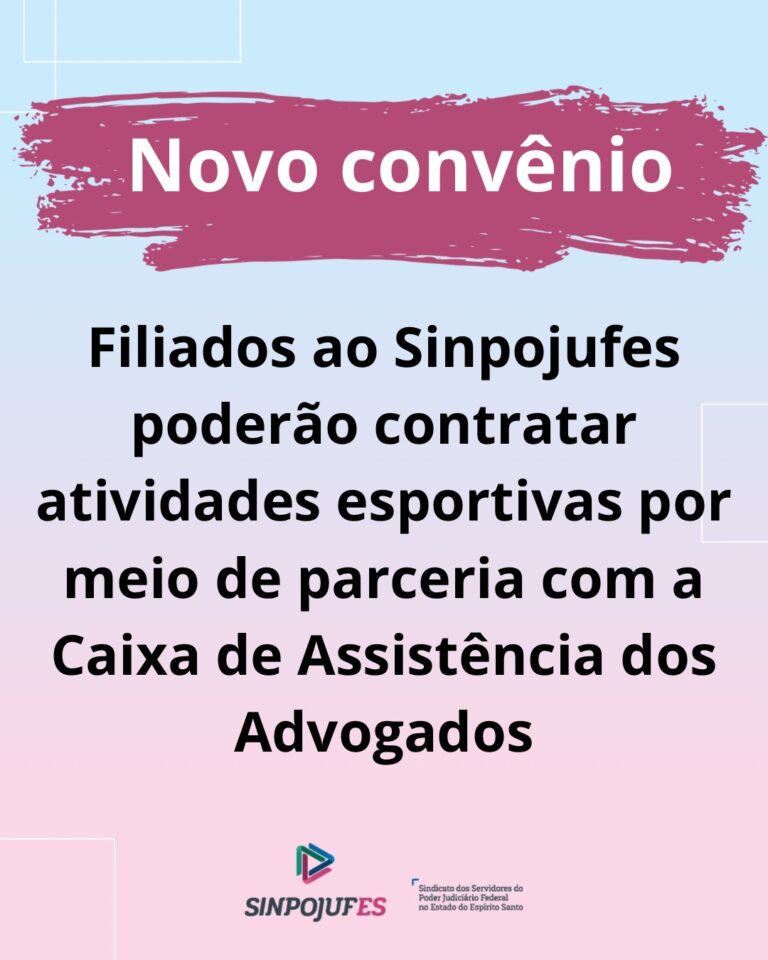 O Sinpojufes e a Caixa de Assistência dos Advogados do Espírito Santo (CAAES) firmaram parceria para que os filiados ao sindicato possam contratar atividades físicas oferecidas em diversos núcleos espalhados pelo Espírito Santo. Entre as modalidades, estão circuito funcional, futebol feminino e masculino, natação e vôlei.