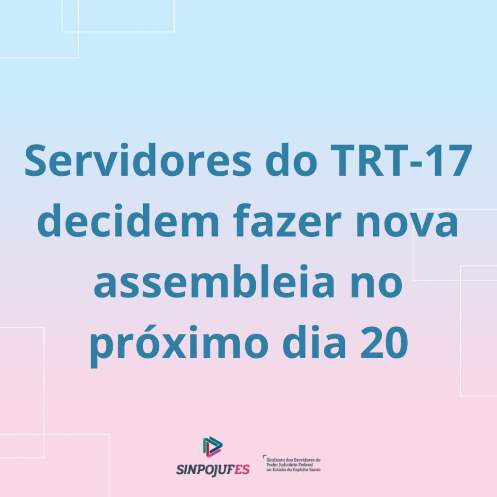 Servidores do TRT-17 decidiram, na última terça-feira (06), realizar uma nova assembleia, no próximo dia 20 de maio, com o objetivo de definir os rumos do movimento grevista em defesa do auxílio-saúde.