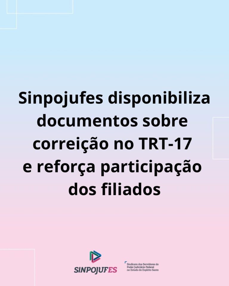 O Sindicato dos Servidores do Poder Judiciário Federal no Espírito Santo (Sinpojufes) informa aos filiados e filiadas da Justiça do Trabalho que estão disponíveis, aqui no site sindicato, os documentos relacionados à correição realizada no Tribunal Regional do Trabalho da 17ª Região (TRT-17).