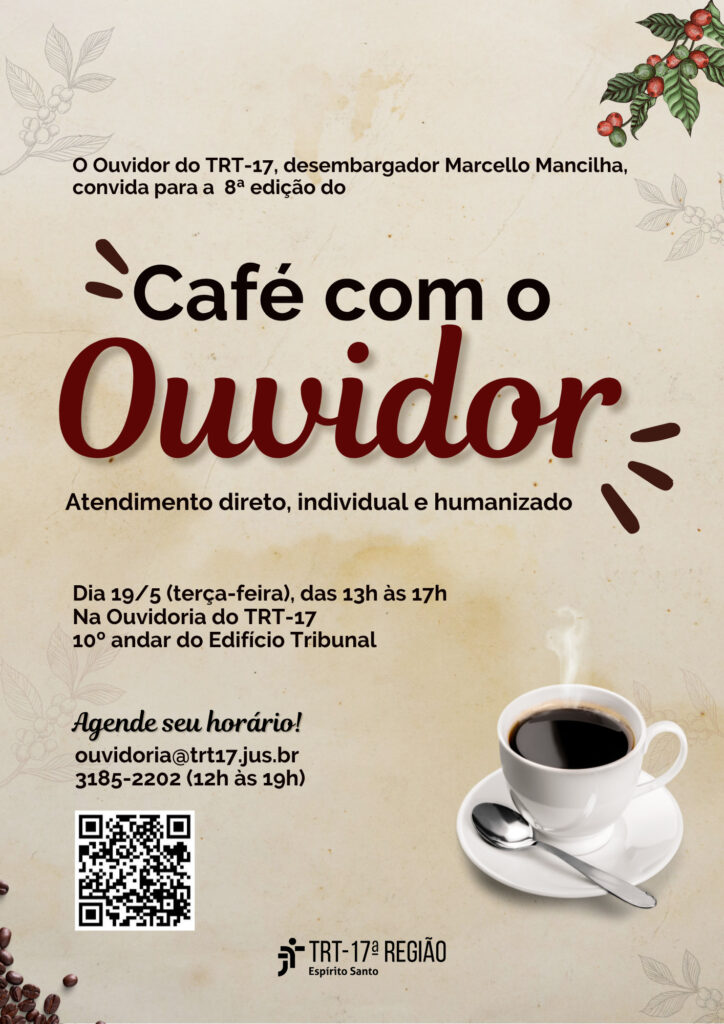 No próximo dia 19 de maio, tem mais uma edição do Café com o Ouvidor, no Tribunal Regional do Trabalho (TRT-17).