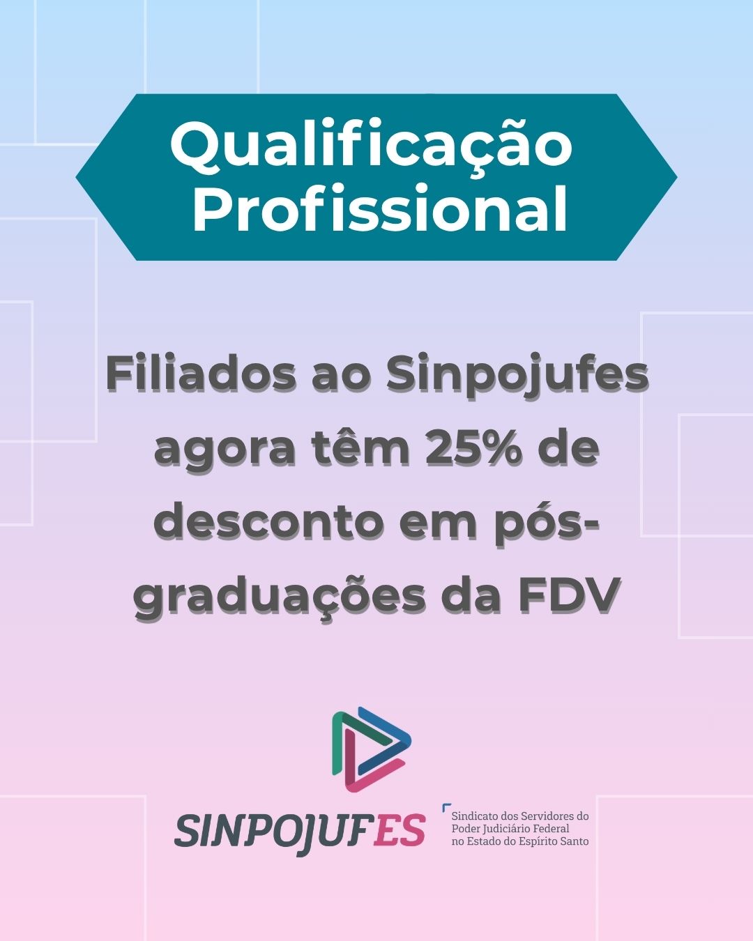 Aqui vem a Categoria Notícias do Sinpojufes Notícia: Filiados ao Sinpojufes agora têm 25% de desconto em pós-graduações da FDV Aqui vem uma Categoria