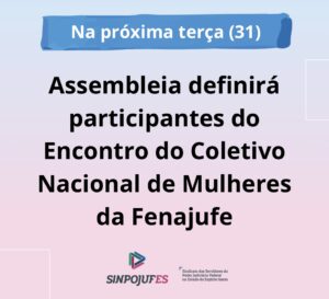 Assembleia definirá participantes do Encontro do Coletivo Nacional de Mulheres da Fenajufe LEIA MAIS Assembleia definirá participantes do Encontro do Coletivo Nacional de Mulheres da Fenajufe LEIAS MAIS