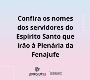 Confira os nomes dos servidores do Espírito Santo que irão à Plenária da Fenajufe LEIA MAIS Confira os nomes dos servidores do Espírito Santo que irão à Plenária da Fenajufe LEIAS MAIS