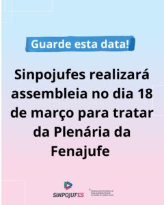 Sinpojufes realizará assembleia no dia 18 de março para tratar da Plenária da Fenajufe LEIA MAIS Sinpojufes realizará assembleia no dia 18 de março para tratar da Plenária da Fenajufe LEIAS MAIS